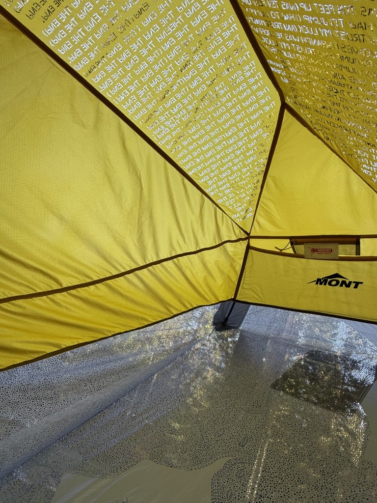 Moondance holds the slow choreography of an extended mountain walk in Banff National Park. This itinerant architecture was repetitiously carried, unpacked, constructed, inhabited, deconstructed and re-packed over several days and nights, operating as both refuge and companion to the solo walker. En route, each interaction was a gesture of ecological and material correspondence; in the studio, iterative mark-making transformed memory into meditative texts and imaginative trajectories. Later, suspended in the forest and illuminated in the early morning light, it hovered as a drawing of air and of attention – a shimmering inquiry into the ethics of inhabitation.